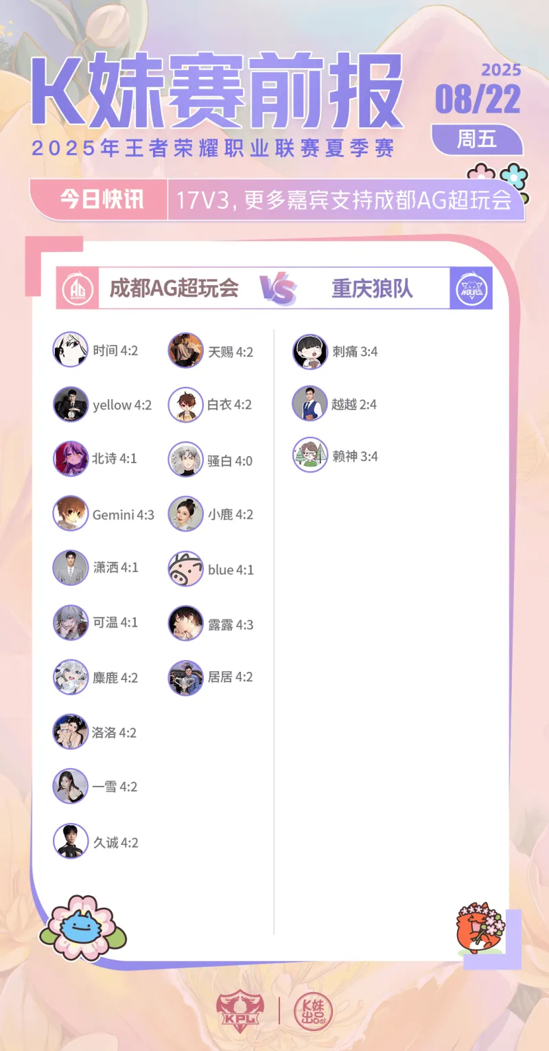 虎扑08月22日讯 [K妹赛前报]17v3,仅赖神、刺痛、越越三人看好重庆狼队